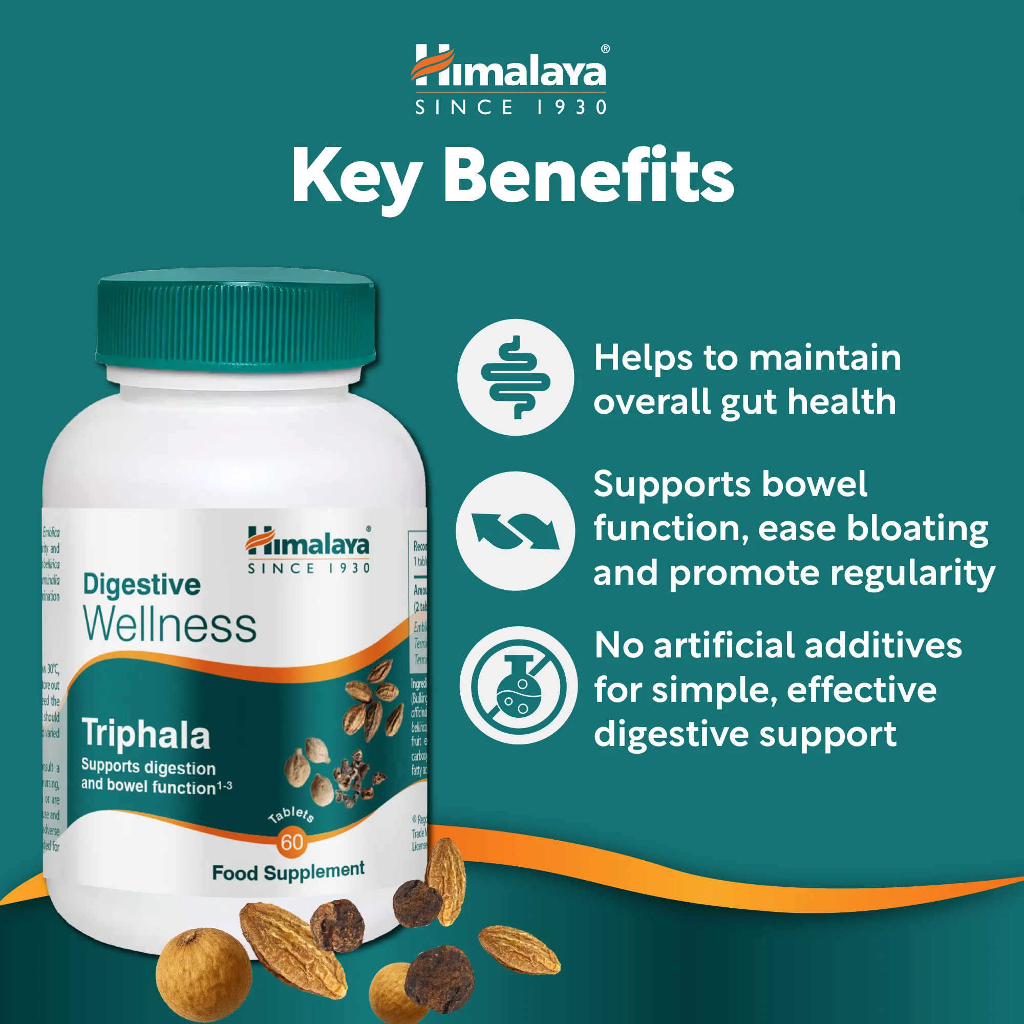 - POWERED BY THREE BALANCING FRUITS – Each tablet contains Triphala powder, a blend of Emblica officinalis, Terminalia bellirica and Terminalia chebula – herbs long used to support bowel function, ease bloating and promote regularity, naturally.